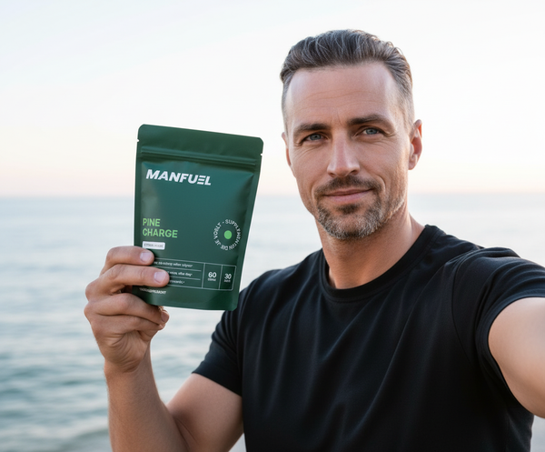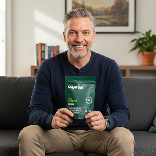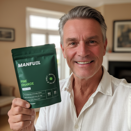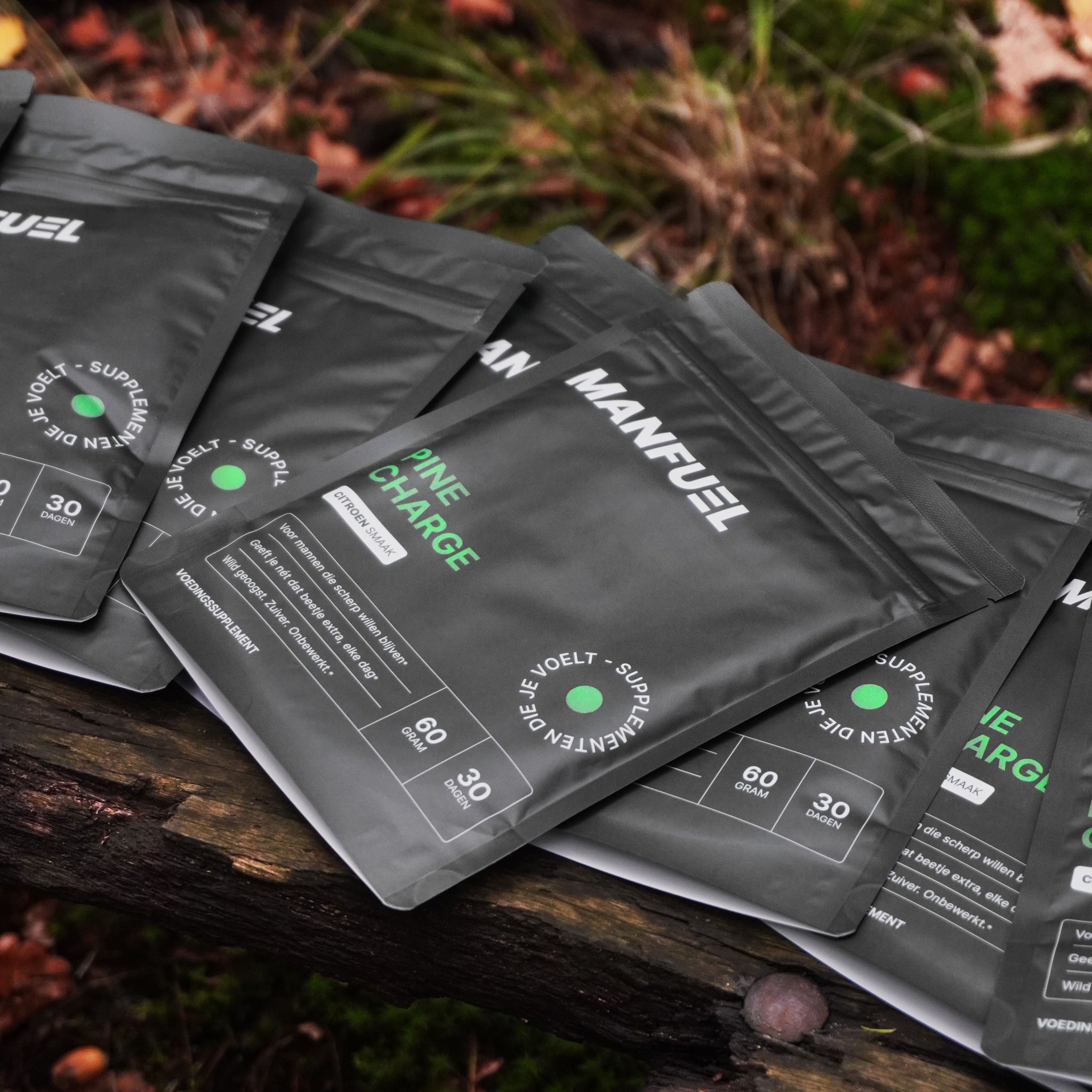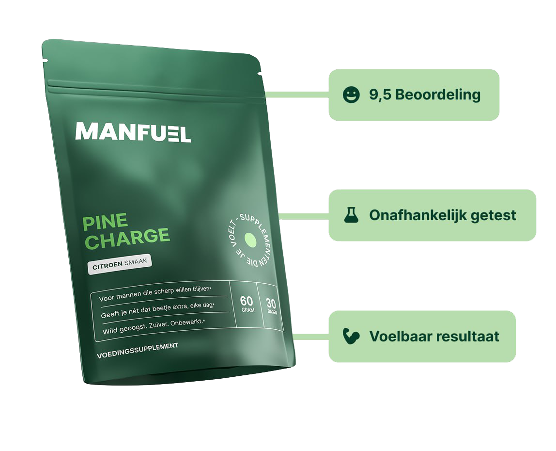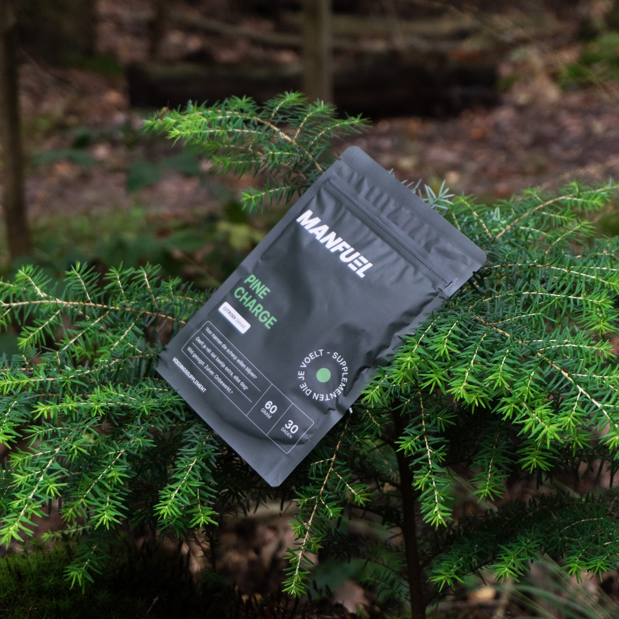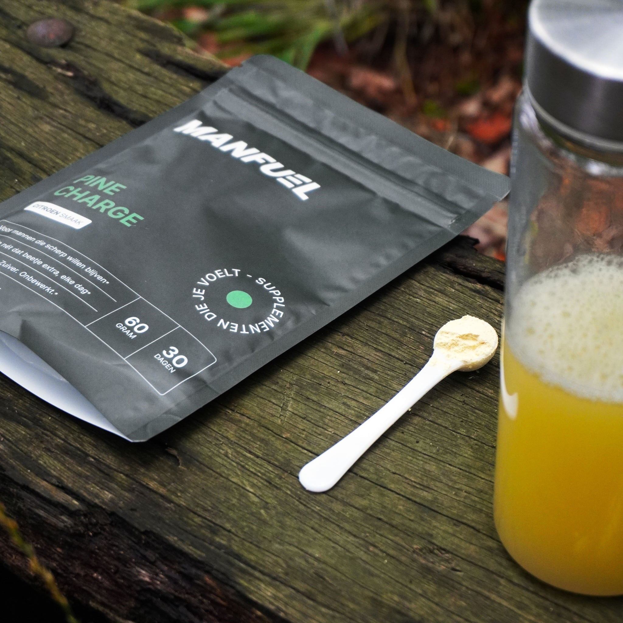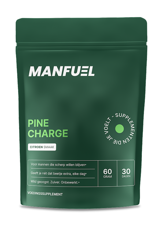 Manfuel Pine Charge bestaat uit maar twee ingrediënten: pine pollen en natuurlijk citroenpoeder. Simpel, zuiver en effectief. Beide ingrediënten zijn onafhankelijk labgetest, zodat jij precies weet wat je binnenkrijgt.