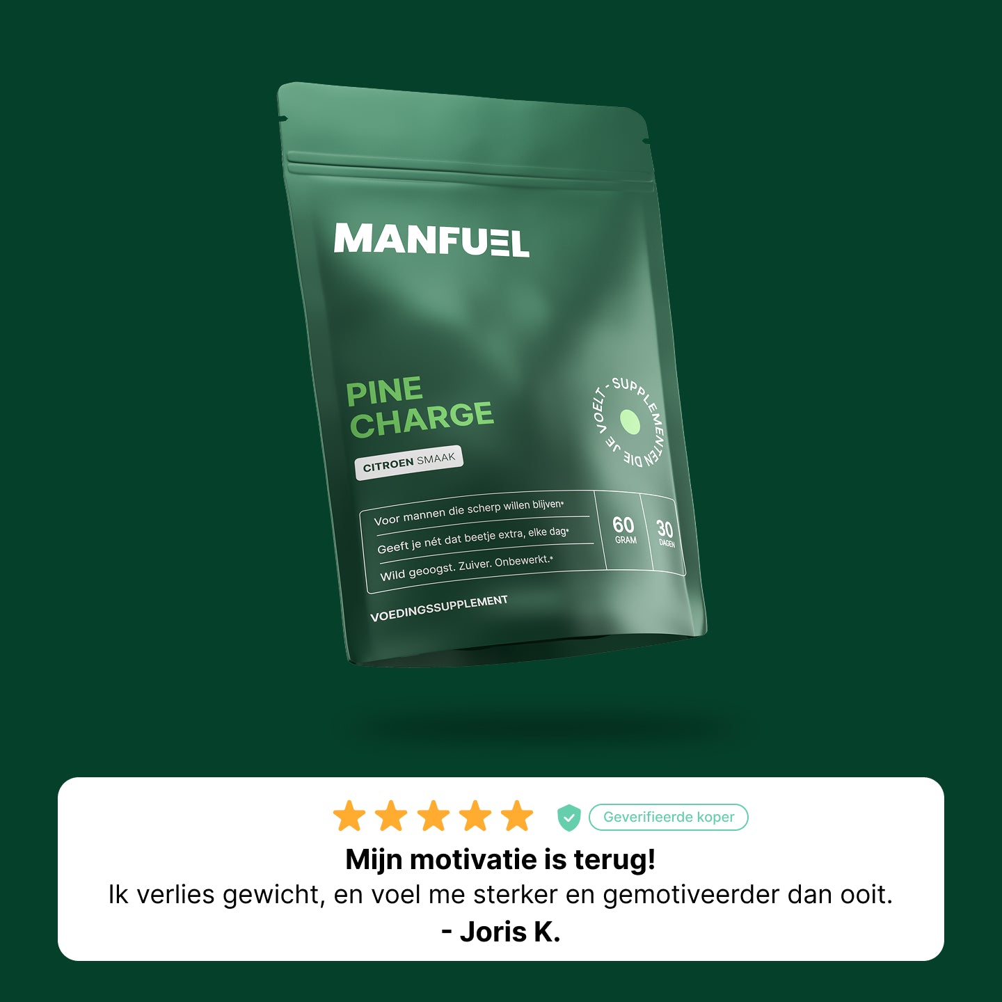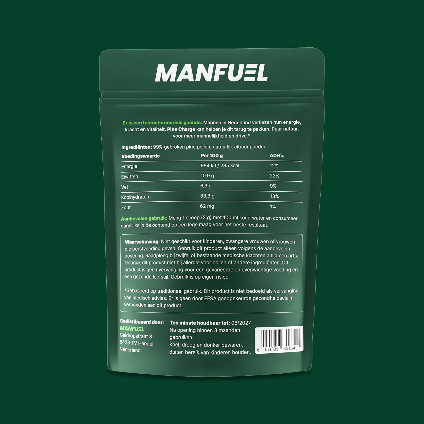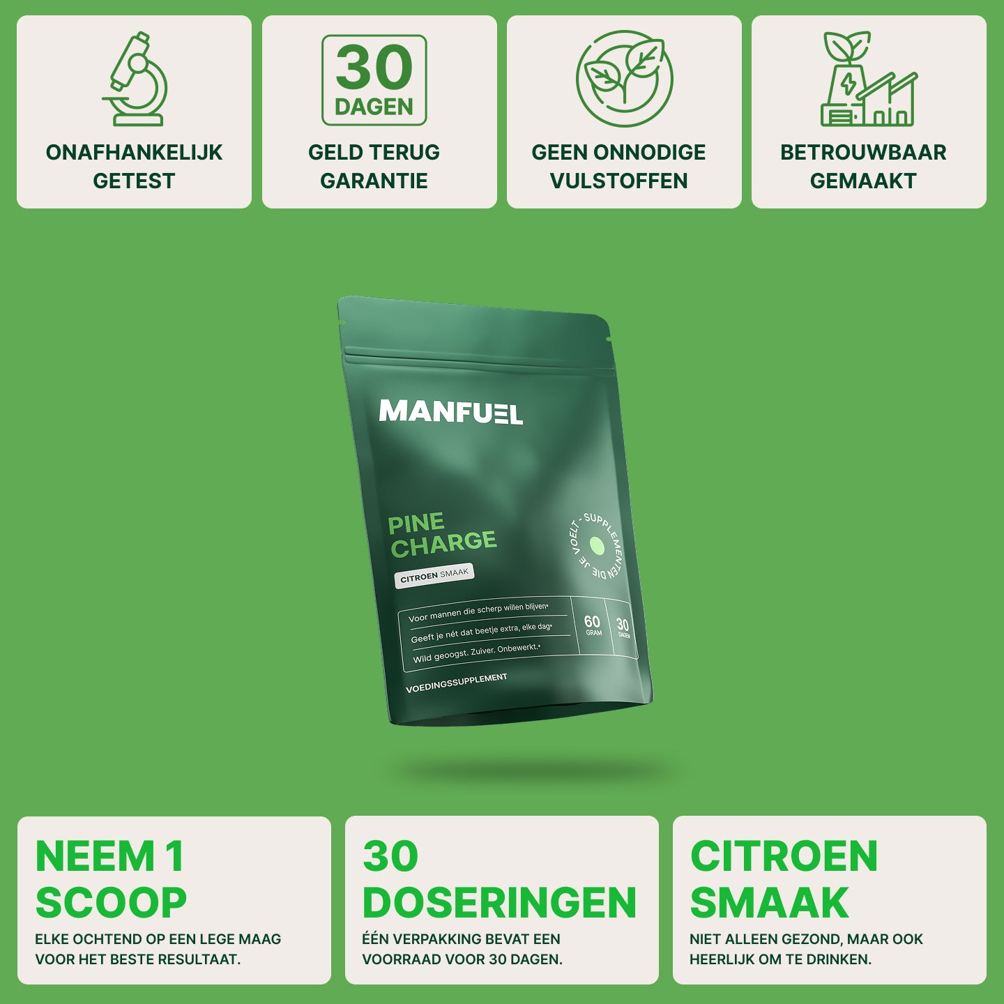 Start je dag met 1 scoop (2g) Pine Charge opgelost in water, op een lege maag.